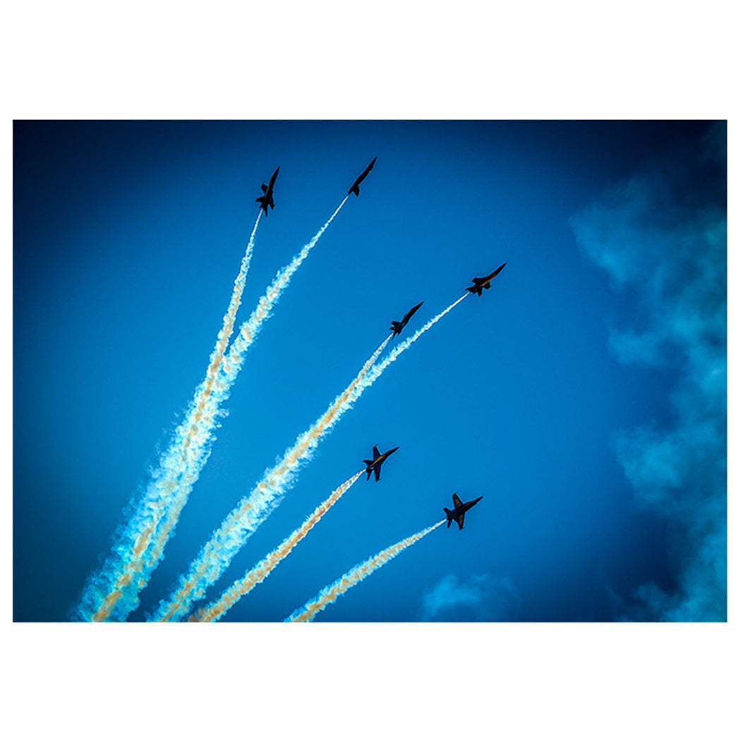 Pure adrenaline, frozen in time. This breathtaking fine art greeting card captures the legendary Blue Angels in a dramatic fan break maneuver, six F/A-18 Hornets slicing through a deep cobalt sky with white smoke trails fanning out behind them like brushstrokes on the most thrilling canvas imaginable. Shot from directly below, the perspective is nothing short of spectacular — bold, powerful, and utterly unforgettable.