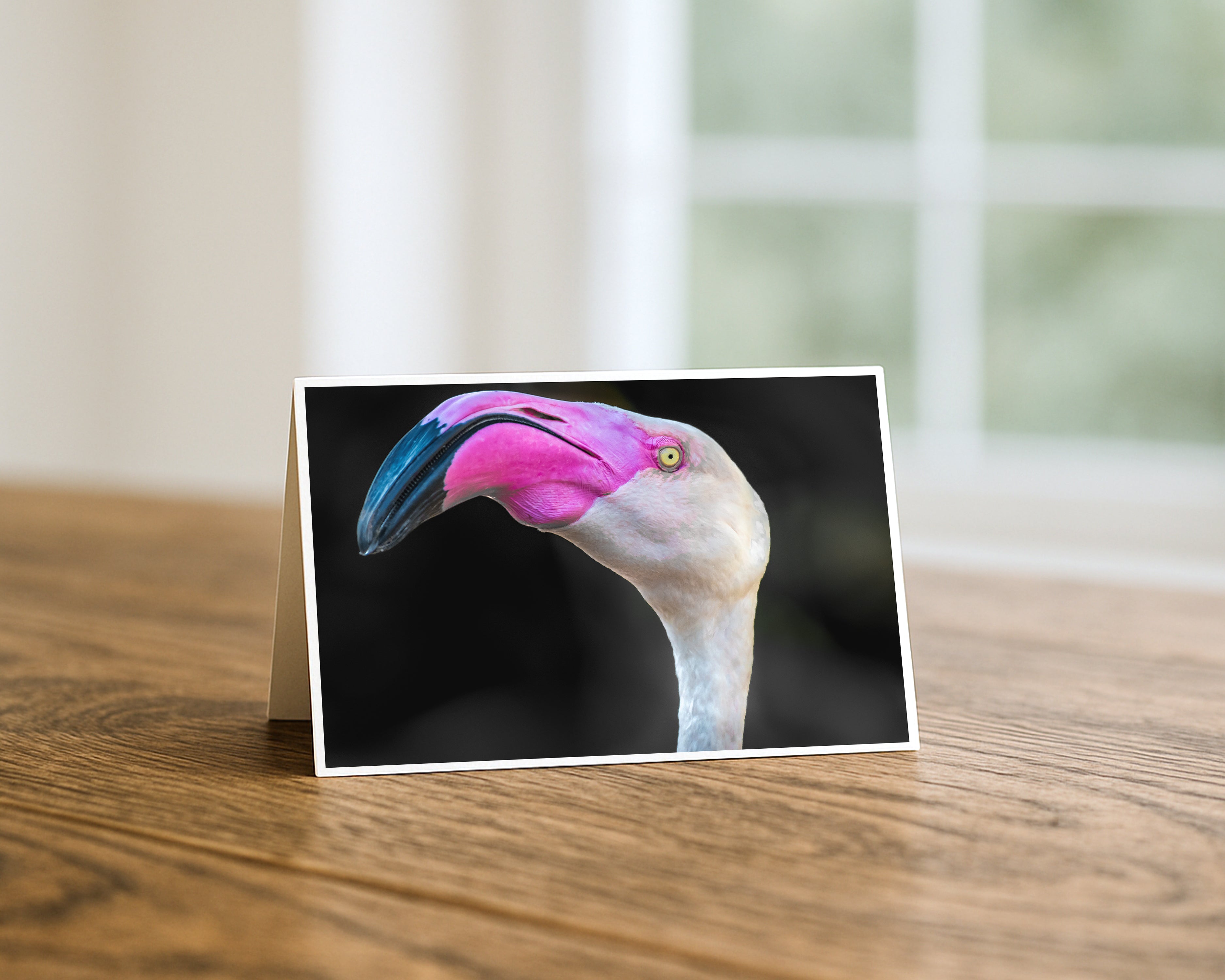 This spectacularly dramatic fine art greeting card features a Greater Flamingo in extreme close-up, its vivid hot pink face, bold downward-curved beak, and that singular pale yellow eye fixed in an expression that can only be described as magnificently unimpressed. Set against a deep black background that would make any Hollywood cinematographer weep with envy, this bird is serving full drama, zero apologies, and an energy that says "I woke up like this and I would like to speak to your manager."